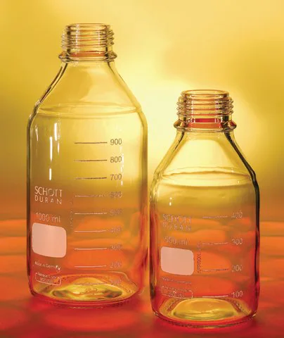 | General description【一般描述】 | Reusable bottles without caps or pouring rings for the storage of reagents, chemicals, solutions, tissue culture media, etc. Made of Duran borosilicate glass, Type 3.3, for maximum chemical and thermal shock resistance. Optional pouring rings prevent drips when pouring from these bottles. |