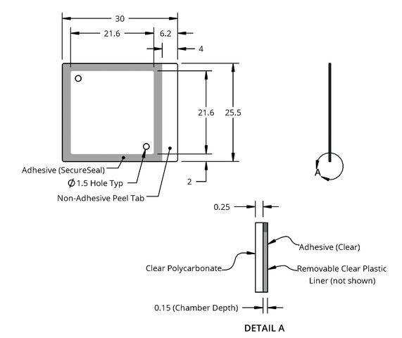 | 规格: | chamber volume 30-50 μL, size L × W × thickness 21.6 mm × 21.6 mm × 0.15 mm, ports diam. 1.5 mm |
