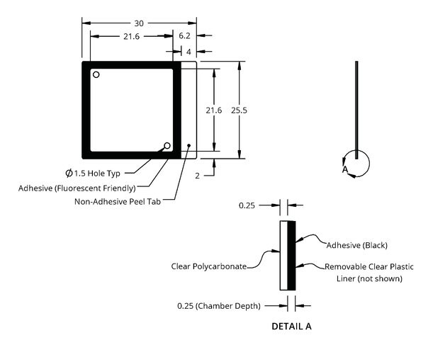 | 规格: | chamber volume 30-50 μL, size L × W × thickness 22 mm × 22 mm × 0.25 mm, ports diam. 1.5 mm |