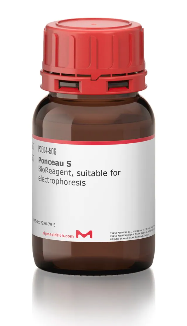 | General description【一般描述】 | Ponceau S是一种重氮染料的钠盐。它可用于制备染色剂,可用于硝酸纤维素膜或PVDF膜(蛋白质印迹)上蛋白质条带的快速可逆染色,也可用于在醋酸纤维素膜上对蛋白进行染色。可通过水洗涤逆转染色过程,其有助于随后的免疫学检测。 以下是两种常见的染色配方: 溶于5%乙酸中的0.1%Ponceau S(w/v) 溶于30%TCA和30%磺基水杨酸中2%Ponceau S(w/v) |