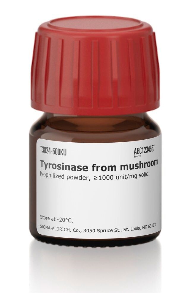 | General description【一般描述】 | 酪氨酸酶是一种含铜氧化酶,对儿茶酚和甲酚具有活性。 酪氨酸酶参与酪氨酸向二羟基苯丙氨酸(DOPA)的转化,而DOPA聚合则导致黑色素形成。酪氨酸酶还参与褐变反应。 据称该酶具有两个芳香族底物结合位点和一个独有的氧铜结合位点。 等电点(pI): 4.7-5 最适pH是6-7 分子量: 128 kDa通过沉降速度扩散;133kDa通过光散射测量,而119.5 kDa通过电泳。 酪氨酸酶是一种含铜氧化酶,对儿茶酚和甲酚都具有活性。 它负责褐变反应。 该酶据报道有两个用于芳族底物的结合位点以及一个用于氧-铜的不同结合位点。 这里的铜很可能是Cu(I),并包括涉及将其氧化至Cu(II)离子的失活。 |