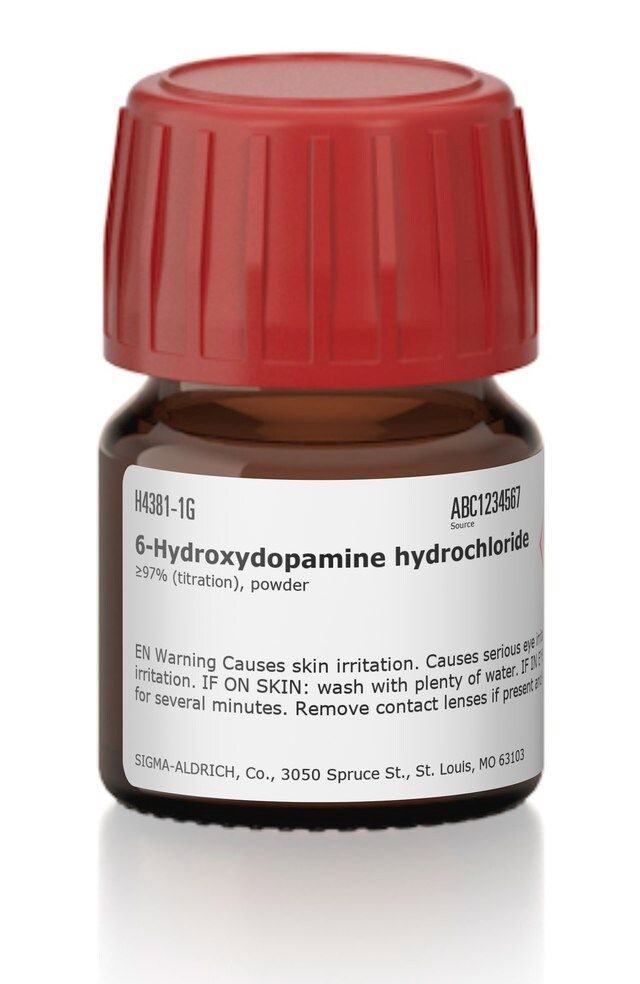 | General description【一般描述】 | 6-羟基多巴胺盐酸盐(6-OHDA)是一种神经毒素,通常用于诱导帕金森症′(PD)。6-OHDA可导致黑质致密部的多巴胺能神经元死亡,从而渐进式模仿PD。6-OHDA是高度可氧化的,其不能穿过血脑屏障。6-OHDA可通过产生活性氧物质,引发细胞应激和细胞死亡而发挥细胞毒性。在很多 体外 模型中,如原代神经元培养、人神经母细胞瘤细胞系、以及大鼠肾上腺嗜铬细胞瘤细胞系PC12,6-OHDA会导致许多神经元细胞的死亡。 |