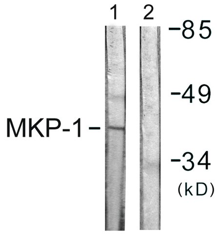 | General description【一般描述】 | MKP1 (mitogen-activated protein kinase phosphatase 1)/DUSP1 (dual specificity phosphatase 1) is a dual specificity phosphatase. It is also called as CL100, 3CH134 and Erp. MKP1 is located in the nucleus and is expressed in several tissues. It is located on human chromosome 5q35. Anti-MKP1 Antibody detects endogenous levels of total MKP1 protein. |
