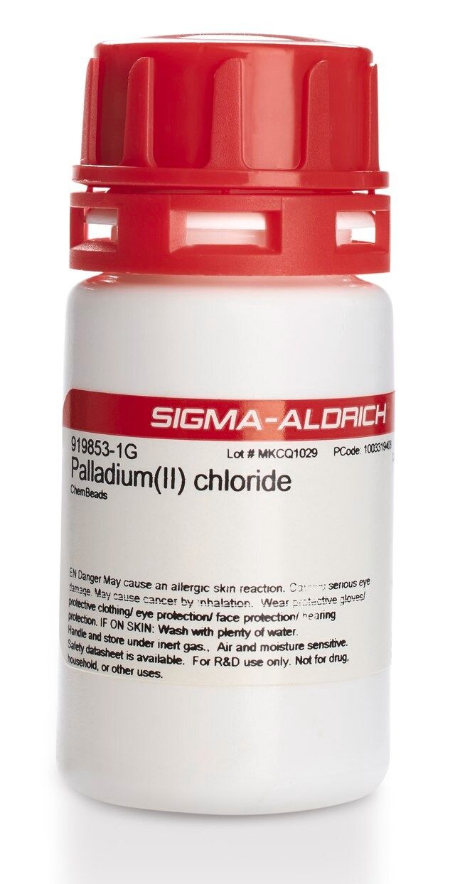 | General description【一般描述】 | Palladium(II) chloride (PdCl2) reacts with unsubstituted or alkyl-substituted cyclic ketones in the CO atmosphere to afford acyclic diesters and acyclic chloro-substituted monoesters. PdCl2 reacts with N,N-dimethylallylamine in methanol to afford di-μ-chloro-bis(2-methoxy-3-N,N-dimethylaminopropyl)dipalladium(II). Palladium dichloride, acetate and acetylacetonate in the [bmim][BF4] or [bmim][PF6] (where[bmim]+ = 1-butyl-3-methylimidazolium cation) ionic liquids have been employed for the hydrodimerization of butadiene to form octa-2,7-dien-1-ol. This product is part of a group of 5 products: CHEMBEADS. These materials are made by mixing a catalog product catalyst with glass beads. |