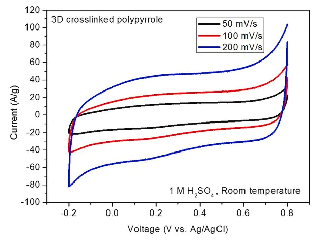 | Application【应用】 | Three-dimensionally cross-linked polypyrrole (3D cross-linked polypyrrole) is a conductive powder made by crosslinking polypyrrole with a dopant molecule - phytic acid. It can form intrinsically conductive hydrogels with a hierarchically porous microstructure. Its porosity promotes transport of electrons and facilitates the diffusion of ions and other small molecules. Its flexibility can also help accommodate the strain caused by volume change during electrochemical cycling. Together with the advantage of high surface area, and biocompatibility, this material provides the feasibility for fabricating flexible, lightweight, energy and bioelectronic devices. Three-dimensionally cross-linked polypyrrole can also been derived into porous carbon nanomaterials via post thermal treatment and activation. The resulted carbon matrix has maintained the hierarchical nanostructure of 3D cross-linked polypyrrole and has been demonstrated as an effective additive to improve energy storage and conversion performance of other electrochemically active materials. |