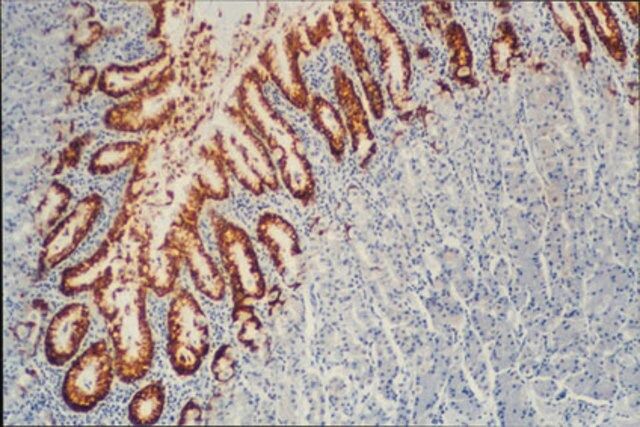 | Specificity【特异性】 | Antibody MAB2011 is specific for the MUC5AC tandem repeat of human mucin. No cross reactivity with other peptides from MUC2, 3, 6, or 7. Immunoreactivity of MAB2011 has been detected in the following normal human epithelial tissues: bronchus, endocervix, stomach, and gallbladder. The predominant staining pattern in normal tissues is perinuclear. Antibody reactivity has been observed in foveolar and mucopeptic neck cells of normal gastric mucosa. The expression of MUC5AC has been frequently observed in gastric carcinomas and may be used as a marker of gastric differentiation. The CLH2 antibody shows a weak reactivity with a high molecular weight smear characteristic of mucin from native mucin extract from normal gastric mucosa and from gastric diffuse carcinoma . The antibody was generated by immunizing mice with a synthetic tandem repeat peptide The antibody recognizes the sequence TTSTTSAP within the tandem repeat of MUC5AC (1). It further recognizes glycosylated as well as unglycosylated MUC5AC. |