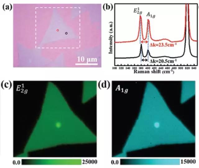 | 图示:(a)MoS2微片的光学显微成像;(b)微片不同位置的拉曼光谱;(c, d)E12g和A1g模式吸收强度的拉曼映射图像 |
