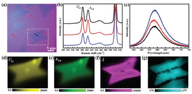 | 图示:(a)MoS2多边形微片的光学显微成像;(b, c)在图(a)白框范围内取点测试的拉曼和PL光谱谱图;(d, e)E12g和A1g模式吸收强度的拉曼映射图像;(f, g)PL的强度映射和峰值漂移映射图像。 |