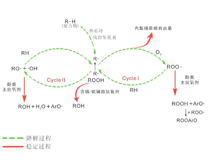 有机化合物的热氧化过程是一系列的自由基链式反应,在热、光或氧的作用下,有机分子的化学键发生断裂,生成活泼的自由基和氢过氧化物。氢过氧化物发生分解反应,也生成烃氧自由基和羟基自由基。这些自由基可以引发一系列的自由基链式反应,导致有机化合物的结构和性质发生根本变化。抗氧剂的作用是消除刚刚产生的自由基,或者促使氢过氧化物的分解,阻止链式反应的进行。能消除自由基的抗氧剂有芳香胺和受阻酚等化合物及其衍生物,称为主抗氧剂;能分解氢过氧化物的抗氧剂有含磷和含硫的有机化合物,称为辅助抗氧剂。