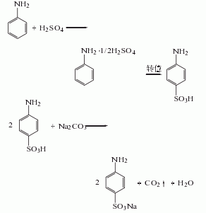 苯胺磺化、转位而得:工艺过程如下:1.转位(磺化反应)在转鼓反应器内加入450kg98%硫酸。转鼓转动后于1h内加入苯胺(99%)400kg。将炉温升至160℃,开启喷射泵使系统的真空度在53.3kPa以上。炉温再升至200℃,保温0.5h。继续升温至260℃,保温至转位完成。以视镜出现黑粉、铁球发出响声为终点,降温,关闭喷射泵,回转10min。排风,冷至80℃,加入2500L水,转动混合,放入地槽。2.中和 在地槽中,物料升温至70-80℃,加入碳酸钠(约230kg)中和至pH=7-7.5。移入到已有600L母液的中和锅中,调整相对密度至1.12左右。加热至沸,加入活性炭4kg,搅拌0.5h。热过滤,滤渣用热水洗涤;滤液蒸浓到相对密度约1.18。放入结晶桶,以8h冷却至30℃。离心过滤,滤液作下批母液;滤饼为对氨基磺酸钠(850kg左右)。总收率86.5%。产品规格:HG2---372--80。外观为粉红色或浅玫瑰色结晶,含量≥97.0%。原料消耗定额:苯胺(99%)460kg/t、纯碱(98%)264kg/t、硫酸(98%)492kg/t。