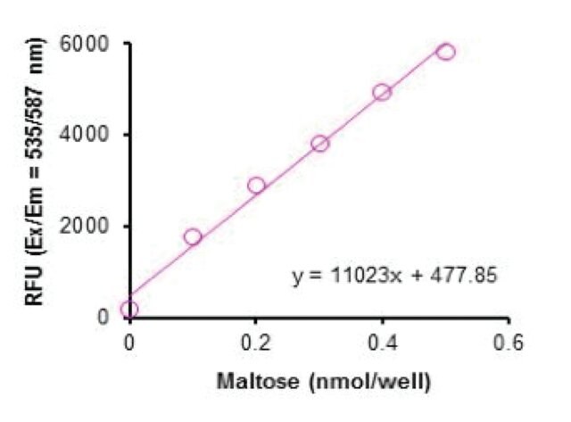 | Principle【原理】 | 麦芽糖含量测定试剂盒提供了一种简单而直接的操作程序,可测定各种样品(包括血清、血浆、食物或生长培养基)中的麦芽糖。在该试剂盒中,麦芽糖通过α-D-葡萄糖苷酶转化为两单位的葡萄糖。葡萄糖被进一步氧化,得到比色(570 nm)//荧光 (λex = 535/λem = 587 nm) 产物。 |