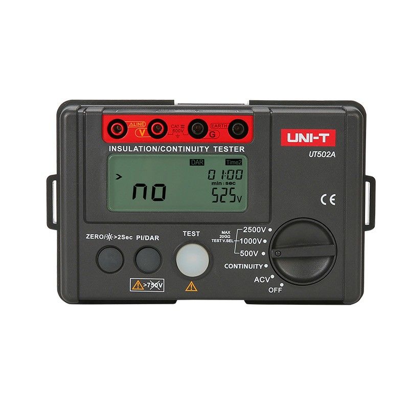UT502A绝缘电阻测试仪,主要用来检查电气设备、家用电器或电气线路对地及相间的绝缘电阻,以保证这些设备、电器和线路工作在正常状态,避免发生触电伤亡及设备损坏等事故。该系列集成绝缘电阻、交流电压、CONTINUITY低电阻、PI极化指数和DAR绝缘吸收比等功能参数测量;是测量变压器、互感器、发电机、高压电动机、电力电容、电力电缆、避雷器等绝缘电阻的理想测试仪器。